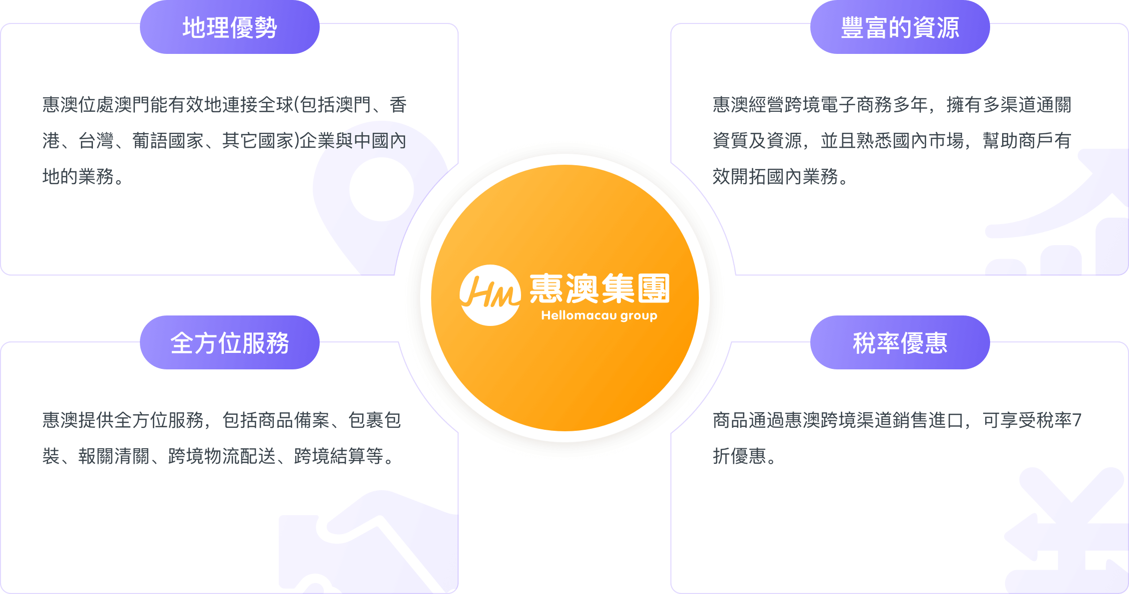 惠澳以綜合服務為支撐,並以專業及個性化的服務幫助客戶在原有的業務上融入科